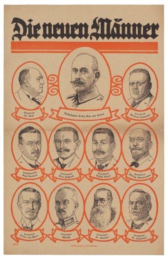 Am 3. Oktober 1918 wurde Prinz Max von Baden von Kaiser Wilhelm II. zum neuen Reichskanzler ernannt. Am gleichen Tag bildete er eine parlamentarische Regierung, die erste parlamentarische Regierung des Kaiserreiches überhaupt. Anlässlich der Regierungsbildung unter Max von Baden wurde ein Flugblatt mit der Aufschrift „Die neuen Männer“ gedruckt und verteilt. Die abgebildeten Männer, deren Bildnisse von Paul Breckmüller gezeichnet wurden, sind: Reichskanzler Prinz Max von Baden, Staatssekretär Mathias Erzberger, Staatssekretär Philipp Scheidemann, Staatssekretär Gustav Bauer, Staatssekretär Dr. Wilhelm Solf, Reichsschatzsekretär Graf Roedern, Handelsminister Otto Fischbeck, Staatssekretär Ritter von Mann, Kriegsminister Heinrich Schëuch, Staatssekretär Dr. Groeber, Staatssekretär Dr. Trimborn. Mit Philipp Scheidemann und Gustav Bauer waren erstmals Sozialdemokraten in der Regierung. Prinz Max von Baden war nur kurze Zeit Reichskanzler. Es folgte, beginnend mit dem Matrosenaufstand Ende Oktober, die Novemberrevolution, die das Deutsche Reich von einer konstitutionellen Monarchie in eine parlamentarisch-demokratisch Republik umwandelte.