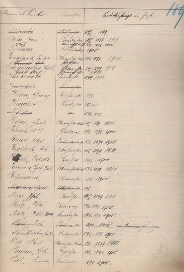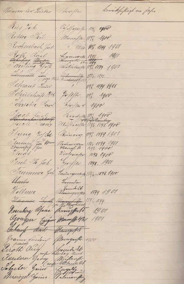 Die vorliegende Liste ist eine Aufstellung der Bäcker in Kreuznach, die in den Jahren von 1896 bis 1901 von der Stadtverwaltung beauftragt wurden, zum Geburtstag von Kaiser Wilhelm II. am 27. Januar „Bubenschenkel“ zu backen. Die Aufträge wurden unter den Bäckern der Stadt gleichmäßig verteilt. 1897 lieferten die Kreuznacher Bäckereien Ferber, Hüge, Merz, Schultheis, Ries, Streug, Staab, Schilling, Engbarth, Albrecht, Schraut, Ritter, Rockenbach, Bohr, Franzmann und Heuchert sowie Knobloch und Martin insgesamt 3488 Bubenschenkel an die Stadtverwaltung Kreuznach.