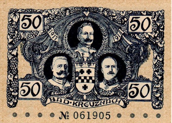 Ein Entwurf eines Notgeldscheins aus der Zeit des Großen Hauptquartiers weist auf die bedeutende Rolle hin, die Kreuznach im Ersten Weltkrieg spielte.