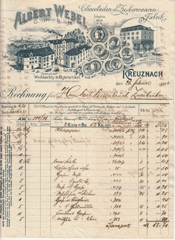 Am 26. Februar 1904 stellte der Kreuznacher Schokoladen- und Zuckerwarenfabrikant Albert Webel (1848-1905), ausgewiesener Spezialist für Weihnachts- und Osterartikel, eine Rechnung an Karl Besenbruch aus. Der aus Zweibrücken stammende Bäcker hatte am 3. Februar 1904 mit einer Bestellkarte gleich mehrere Artikel im Wert von 70,22 Mark für Ostern angefordert, die ihm aus Kreuznach in zwei Kisten per Frachtgut zugestellt wurden, darunter: „10 Fondant Hasen, 10 Liquer Eier rosa und 50 gem. Körbchen“. Wenig später, am 28. März 1904, zog Albert Webel mit seiner Familie nach Bad Reichenhall, wo er 1905 verstarb. Seine Kreuznacher Schokoladenfabrik hatte er im April 1904 verkauft.