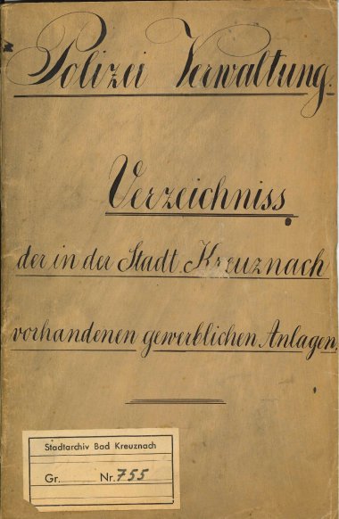 Die Akte 755 enthält ein alphabetisches Verzeichnis von annähernd 300 gewerblichen Anlagen aus Kreuznach. Neben den Namen der Besitzer sind Firmenbezeichnungen und Adressen vermerkt. In der Liste sind Manufakturen und Handwerksbetriebe ebenso erfasst wie Firmen mit mehreren hundert Mitarbeitern. Dazu zählen zum Beispiel eine Flaschenfabrikation, mechanische Werkstätten, Bäckereien, eine Kaffeerösterei, ein Dreschbetrieb, eine Schaumwein- und eine Mineralwasserfabrik, eine „Pianofortefabrikation“, Ziegeleien, eine chemische Fabrik, Buchdruckereien, Schreinereien, eine „Teig=Waaren Fabrik“, eine Lack- u. Firnis-Fabrikation, eine Kisten- und Strohhülsenfabrik, ein Musikwerk (Musikautomatenhändler), ein Holzsägewerk sowie Mühlenbetriebe.
