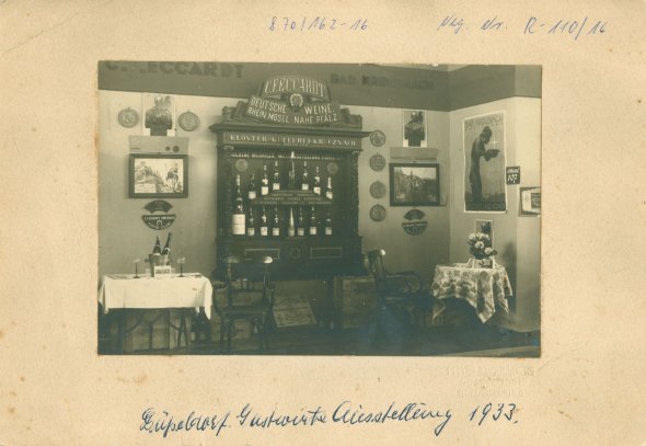 Die Schwarz-Weiß-Aufnahme zeigt den Informationsstand der um 1890 gegründeten Bad Kreuznacher Kloster-Kellerei C.F. Eccardt auf einer Ausstellung. Aufgenommen wurde das Foto von „Photo Kronenberg“ in Düsseldorf, Hofgartenstraße 8. Die handschriftlich ergänzte Information „Düsseldorf Gastwirte Ausstellung 1933“ konnte nicht bestätigt werden. Der Weingroßhändler Carl Ferdinand Eccardt (1848-1922) wirbt mit seinem Stand 107 für den deutschen Wein (Rhein, Mosel, Nahe, Pfalz), der Präsentationsschwerpunkt liegt jedoch auf dem Nahewein, seinem Wein aus Bad Kreuznach.