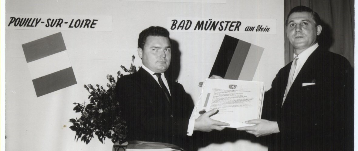 Die Partnerschaftsurkunde unterzeichneten damals Bürgermeister Friedrich Wilhelm Haudel (rechts) und sein französischer Kollege Dr. Jean MonnerotSeit November 1985 ist der Deutsch-Französische Freundschaftskreis (DFFK) Bad Münster am Stein-Ebernburg und Pouilly-Sur-Loire Motor der Partnerschaft. Gründungsvorsitzender war Jo Enders (bis 1991), dann führte Hans-Otto Kunz von 1992-2019 den DFFK. Aktuell ist Dr. Rudolf Mackeprang Vorsitzender. Auf der Partnerseite beim Comité Jumelage hat Francoise Maitrepierre den Vorsitz.