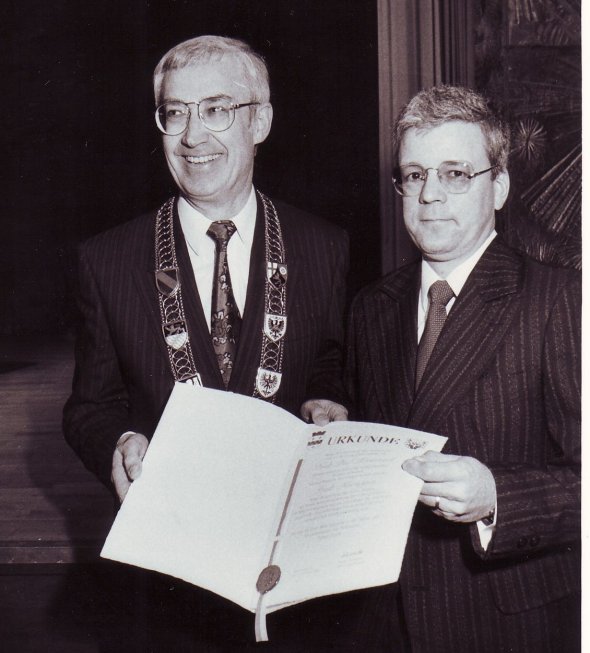 Oberbürgermeister Helmut Schwindt (links) und Bürgermeister Rainer Frank mit der PartnerschaftsurkundeNach mehreren vergeblichen Anläufen war knapp ein Jahr vor dem Fall der Mauer der Weg frei.