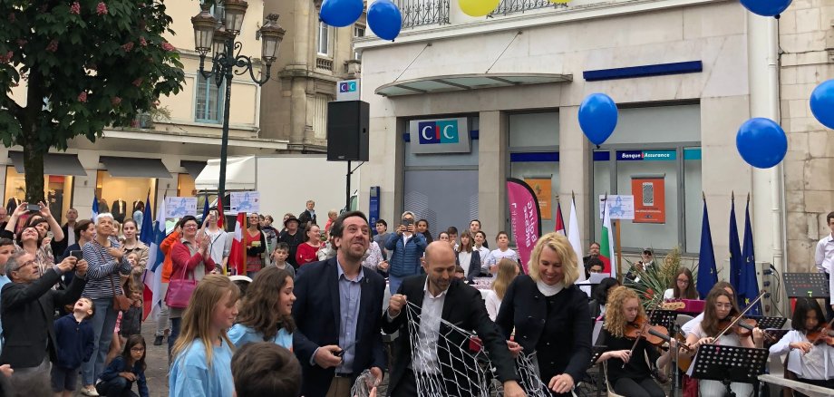 Die rund einstündige Veranstaltung auf dem Kornmarkt wird neben einer Ansprache der Stadtchefin, die von ihrem saarländischen Amtskollegen, dem Neunkircher Oberbürgermeister Jürgen Fried, begleitet wird, von den Bad Kreuznacher Schülerinnen und Schülern gestaltet: Die Bläsergruppe des Lina-Hilger-Gymnasiums und die Waldorfschule Bad Kreuznach sorgen für Musik und Tanz; die Schülerfirma der Crucenia Realschule plus bietet kleine Häppchen an. Die Feier endet mit dem gemeinsamen Steigenlassen von Ballons in den Europafarben Blau und Gelb/Gold und der Europahymne zum Mitsingen.