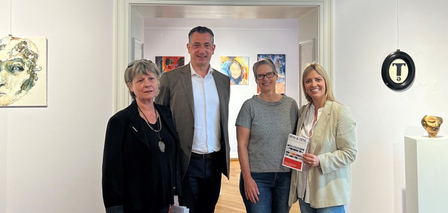 Foto: Bei der Finissage im Museum Schlosspark bedankten sich Oberbürgermeister Emanuel Letz und Nathalie Herberger, Geschäftsleitung, und zuständige Leitung Städtepartnerschaften und Internationale Beziehungen, bei Annette Thiergarten (2.v.r.) und bei Dany Madier, Präsidentin von arte-cité Bourg (links). Foto: Caroline Heise