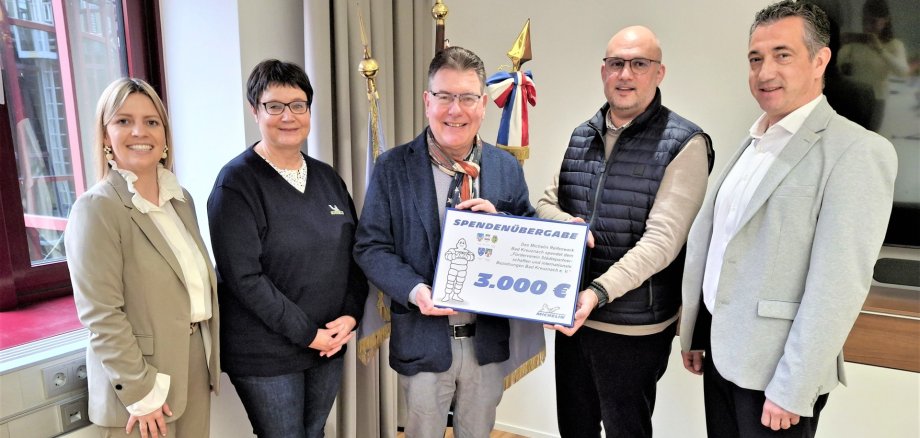 Foto (v.l.): Geschäftsleitung Nathalie Herberger, Ulrike Dalheimer, Unternehmenskommunikation Michelin Bad Kreuznach und Trier, Achim Kliebsch, Vorsitzender des Fördervereins für Städtepartnerschaften, Guilhem Vogel, Werkdirektor Michelin Bad Kreuznach, OB Emanuel Letz. Foto: Isabel Gemperlein