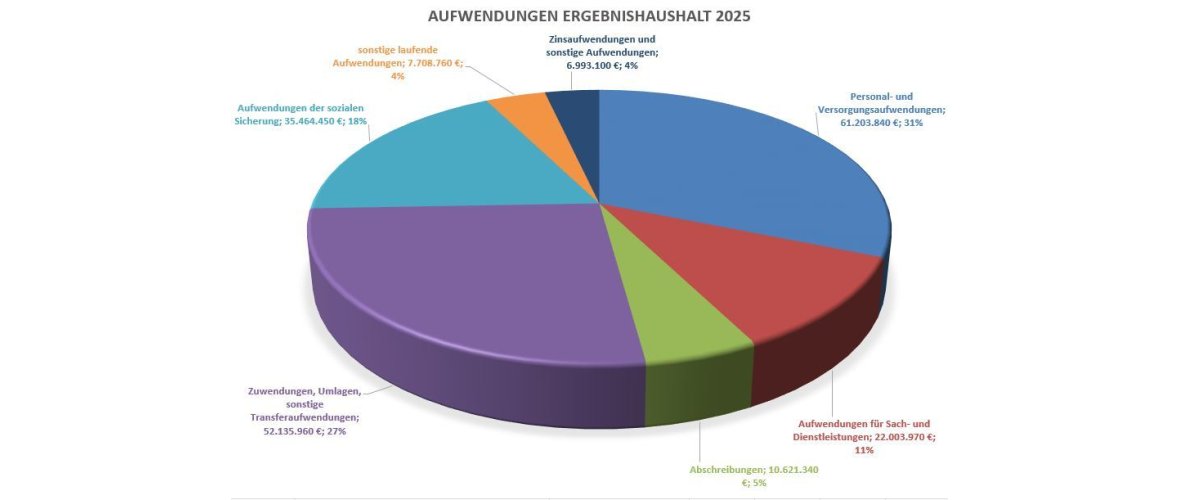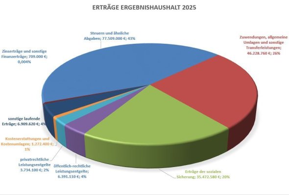 Insgesamt stehen im Ergebnishaushalt Erträgen in Höhe von rund 178,23 Mio. Euro Aufwendungen in Höhe von rund 196,13 Mio. Euro gegenüber.