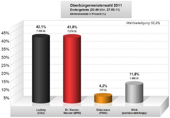 Bei der OB-Wahl am 27.03.2011 erhielt keiner der Kandidaten die absolute Mehrheit, so dass am 10.04.2011 eine Stichwahl erforderlich wurde.