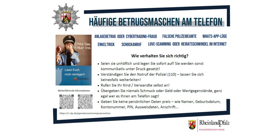 Betrüger nutzen immer wieder raffinierte Maschen, um am Telefon oder über digitale Kanäle an Geld und persönliche Daten zu gelangen. Besonders gefährdet sind ältere Menschen. Um gezielt auf diese Gefahren hinzuweisen, stellt das Polizeipräsidium Mainz wichtige Informationen und Verhaltenstipps bereit.