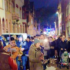 Der Martinsumzug startete auf dem Spielplatz in der Kilianstraße und bahnte sich illuminiert von vielen Laternen und musikalisch begleitet von den „Musikfreunden Winzenheim” seinen Weg zum Pocket Park.