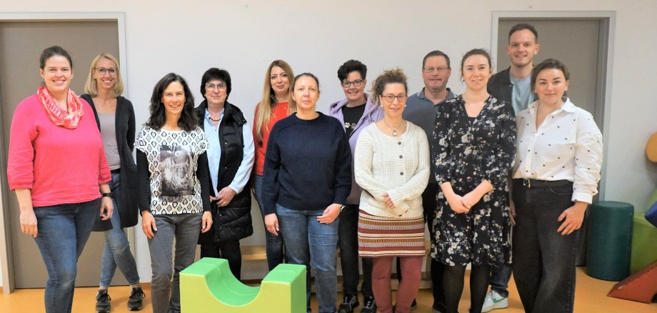 Großes Foto: Das Team der Kita Jungstraße mit (v.l.) Natalia Vera, Cindy Cordes, Referentin Anke Wolfram, Ursula Dhom, Stephanie Körber, Sabine Koboldt, Nadine Tipton, Vera Grießhammer, Thomas Rasch, Dagmar Roth, Nils Wachner und Nadiya Manjachin