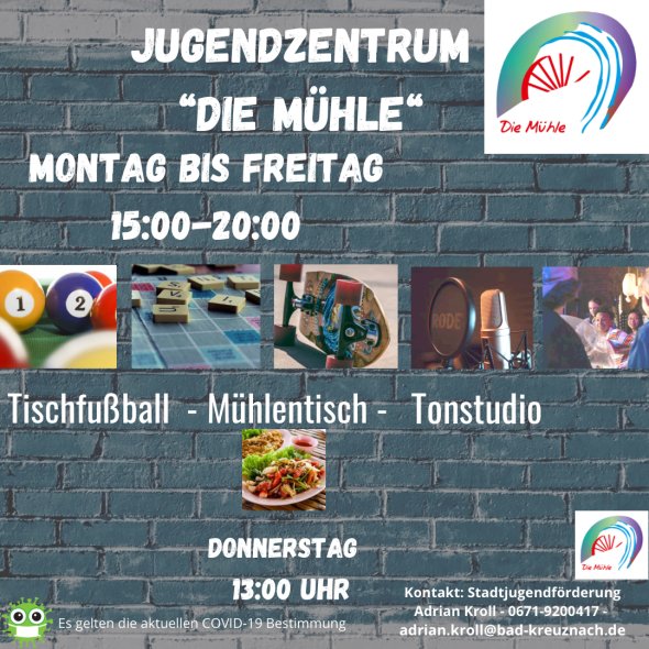 Der offene Bereich der Mühle ist ein Treffpunkt für Jugendliche und verfügt über einen Billardtisch, Tischfußball, PC, unterschiedliche Gesellschaftsspiele, verschiedenste Konsolen, Mobiliar zum Treffen und „Chillen“ sowie eine kleine Küchenzeile. Darüber hinaus besteht die Möglichkeit kreative Angebote durchzuführen. Die zusätzlichen Projekträume, wie ein Tonstudio, eine Werkstatt für Holz und ein analoges Fotolabor stehen zur Verfügung und können nach Absprache von der Zielgruppe genutzt werden. In der Regel ist der Jugendtreff montags bis freitags von 14:00 Uhr bis 19:00 Uhr geöffnet. Mehr Infos und aktuelle Angebote sind auf Instagram zu finden.