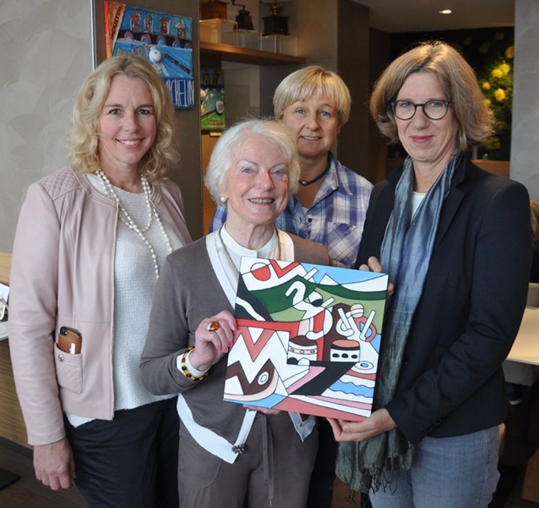 Oberbürgermeisterin Dr. Heike Kaster-Meurer lud die Siegerklasse mit der höchsten Spende (die heutige 6e mit 1681,20 Euro) in die Blaue Eisdiele ein und belohnte damit das ehrenamtliche Engagement. Gemeinsam mit Guntrun Bencker und Georg Schmidt freute sich Schulleiterin Anna Dicke (Foto unten rechts) über das bunte Gemälde, das Elisabeth Eminger (Foto mitte) als Geschenk aus Ruanda mitgebracht hatte.