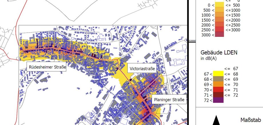 Grafik: Die Lärmkarte zeigt es: In der Rüdesheimer Straße ist die Lärmbelastung sehr hoch - genauso in der Wilhelmstraße.
