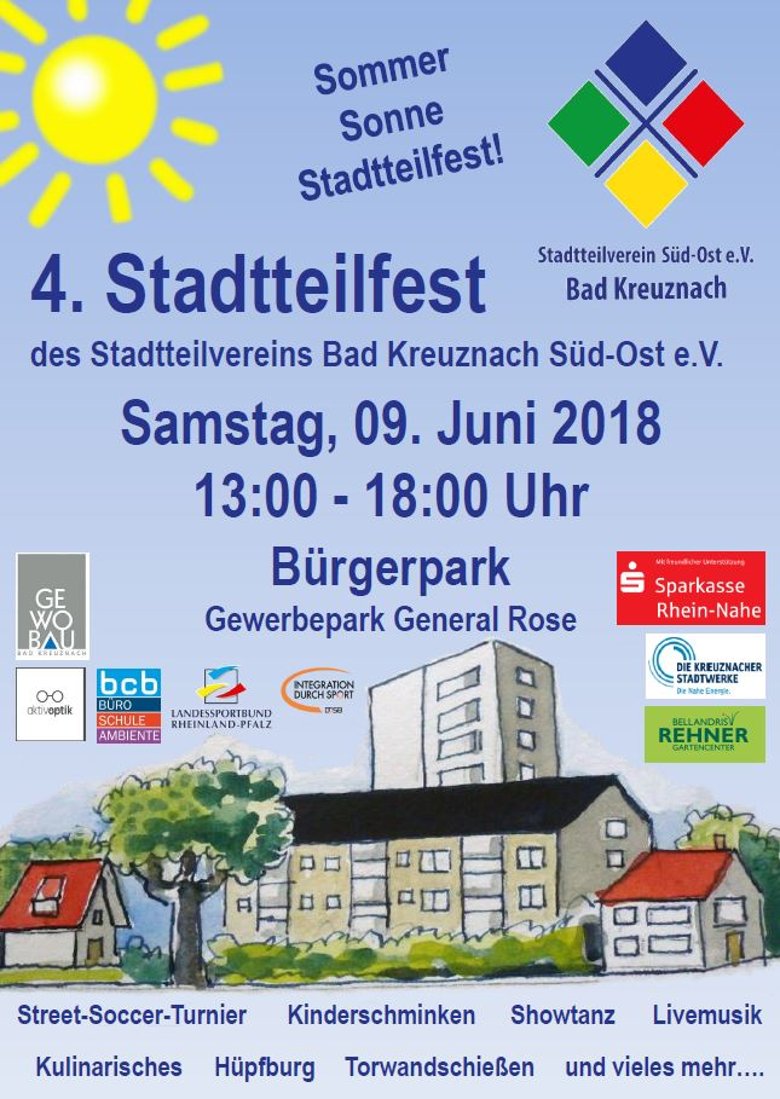 Zu den Höhepunkten gehören unter anderem diverse Showtanzgruppen, eine Hüpfburg und eine Torwand zum Torwandschießen des Landessportbundes Rheinland-Pfalz, Kinderschminken und vieles mehr. Zudem werden Vorführungen an der neu errichteten Calisthenics-Kraftstation stattfinden und natürlich kann der erfolgreiche Abschluss unseres Projektes „Lecker-Schmecker-Bürgerpark“, der kleinen, bunten und essbaren Oase, im Rahmen der Initiative „Essbares Bad Kreuznach“ besichtigt werden. Parallel zum Stadtteilfest werden wir ein Fußballturnier, den 1. Soccer Cup Bad Kreuznach Süd-Ost, auf der im Bürgerpark fest installierten Street-Soccer-Anlage, austragen. Auch für das leibliche Wohl ist selbstverständlich bestens gesorgt und DJ Jonny Klotsche sorgt musikalisch für gute Stimmung.