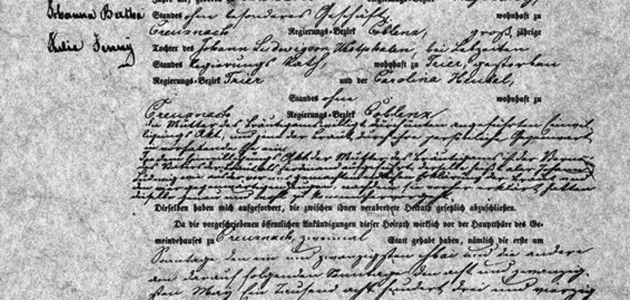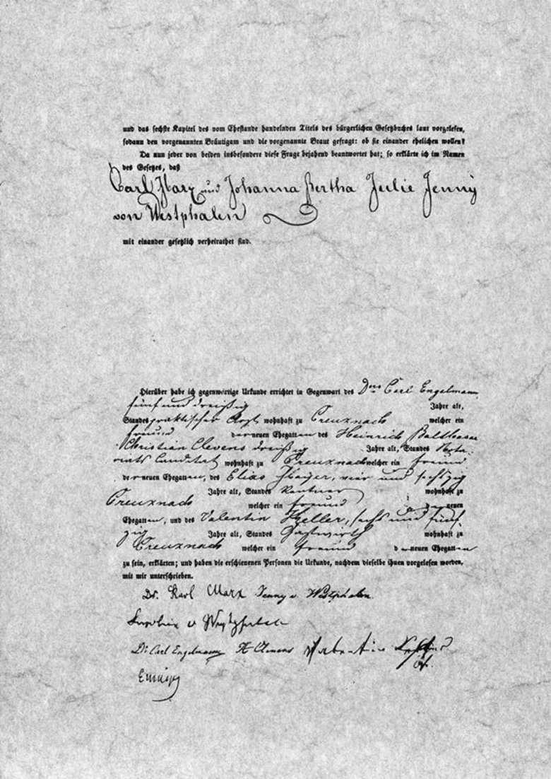 Im Personenstandsregister der Stadt Kreuznach von 1843 wurde am 19. Juni 1843 unter der Nr. 51 die Eheschließung von Dr. Karl Marx (1818-1883) mit Jenny von Westphalen (1814-1881) eingetragen, nachdem Oberbürgermeister Franz Buss (1790-1883) der Aufforderung des Paares gefolgt war, die zwischen dem Brautpaar „verabredete Heirath gesetzlich“ vorzunehmen. Dem vorausgegangen war die vorgeschriebene öffentliche Ankündigung am 21. und 28. Mai. Diese war vor der Haupttür des Gemeindehauses in Kreuznach erfolgt und hatte keinerlei Widerspruch nach sich gezogen, der gegen eine Vermählung gesprochen hätte.