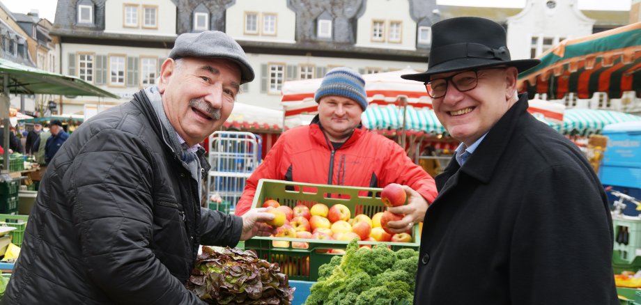 Foto: Initiieren das „Restaurant des Herzens“ im Korellengarten: Franz-Xaver Bürkle und Karl-Heinz Seeger beim Einkauf auf dem Wochenmarkt.