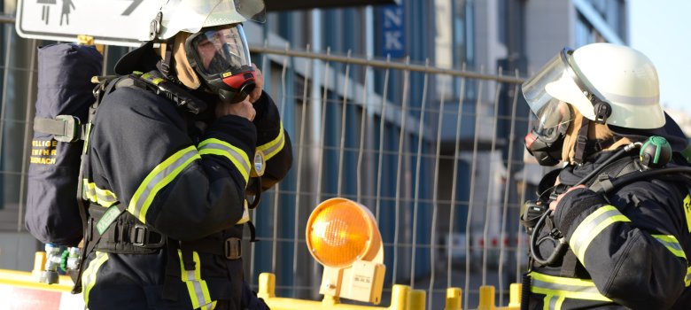 Die ersten angerückten Kräfte öffneten mit einem hydraulischen Türöffnungswerkzeug die Haupteingangstür, um in das Gebäude zu gelangen. Zwei Trupps unter Atemschutz gingen mit 2 C-Rohren zur Personenrettung und Brandbekämpfung über das Treppenhaus vor. Parallel wurde die Drehleiter in Stellung gebracht, um die beiden auf dem Dach befindlichen Personen zu retten. Die Person mit der Rückenverletzung musste schonend auf einer Trage auf der Tragehalterung am Korb der Drehleiter zu Boden gebracht werden. Dafür hatte sich Volksbankmitarbeiter Odo Steinmann (Vorstand Leitung Produktion/Steuerung) freiwillig gemeldet. Die Atemschutztrupps hatten nach und nach die vier Personen im Gebäude aufgespürt und ins Freie verbracht. Dabei wurden verschiedene Türöffnungsmethoden mit diversen Aufbruchswerkzeugen angewendet. Für eine Person kam jede Hilfe zu spät. Sie wurde in einer Schleifkorbtrage nach unten getragen. Die verrauchten Räumlichkeiten wurden mit einem Belüftungsgerät entraucht. Nach etwa einer Stunde hieß es dann Übungsende. An der Übung nahmen über 30 Feuerwehrleute mit insgesamt sieben Fahrzeugen des Löschbezirks Süd und der Freiwilligen Feuerwehr Hackenheim teil. Die Übungsleiter waren mit dem Ergebnis und der Zusammenarbeit der Wehrleute sehr zufrieden, besonders weil eine Außentemperatur von weit über 30°C vorherrschte und die Wehrleute besonders bei der Personenrettung unter Atemschutz in der Hitzeschutzbekleidung dadurch an ihr Limit gehen mussten. Odo Steinmann und Andreas Weber (Bauleiter der Firma Schoofs aus Frankfurt am Main) bedankte sich für den gezeigten Einsatz der Wehrleute und luden im Anschluss zu Kaltgetränken und Verpflegung ein. Auch die Übungsleiter und die Wehrleiterin Manuela Liebetanz bedankten sich beim Vorstand der Volksbank Rhein-Nahe-Hunsrück für die Möglichkeit in dem Objekt unter sehr realen Bedingungen üben zu können. Wo können sonst Türen zu Übungszwecken aufgebrochen werden? Und auch das will bei einem Realeinsatz geübt sein. Alexander Jodeleit, Pressewart der Freiwilligen Feuerwehr Bad Kreuznach |