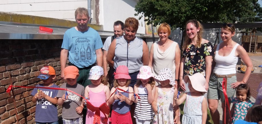 Foto: Die Mühe hat sich gelohnt, v. l.: Bauhof-Mitarbeiter Thomas Berg und Frank Zimmermann, Berufspraktikantin Gihen El Turk, Jugendamtsleiterin Sabine Raab-Zell, Kita-Leiterin Tamara Lenz sowie Kita-Mitarbeiterin Anna Wolanski mit den Kindern bei der Einweihungsfeier des neuen Barfußpfads.