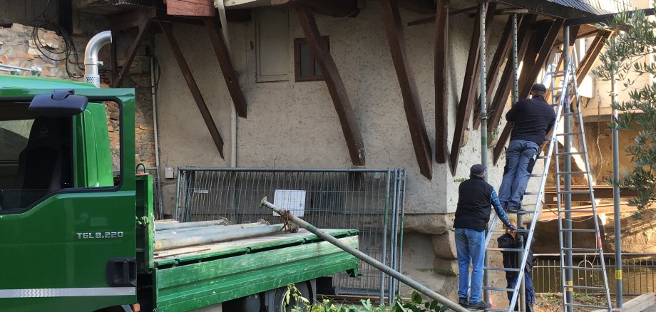 Das Brückenhaus, erbaut 1609 und unter Denkmalschutz stehend, weist erhebliche Schäden am Tragewerk auf. Durch Umbauten und damit einhergehende statische Veränderungen sind Balken gebrochen oder verformt. Außerdem ist das Holz durch Schädlinge angegriffen. Schon im Frühjahr war der beauftragte Architekt Sandro Ferri zu dem Ergebnis gekommen, dass das Gebäude zur Instandsetzung mit einem Stahlgerüst abzustützen werden muss. Nächste Woche werden die Stahlstützen gegen stärkere, nicht sofort verfügbare, ausgetauscht.