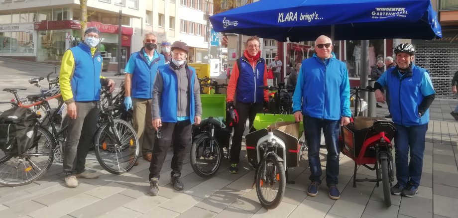 Foto: Auch in Corona-Zeiten für die Kundinnen und Kunden da: die Ehrenamtlichen der KLARA-Lastenradinitiative an ihrem Stand auf dem Kornmarkt.