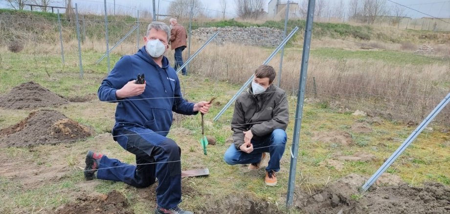 Fotos: Winzer Paul Anheuser (links) aus Bad Kreuznach pflanzte mit Neuruppins Bürgermeister Nico Ruhle am Gründonnerstag auf dem Neuruppiner Weinberg 30 neue Weinreben.