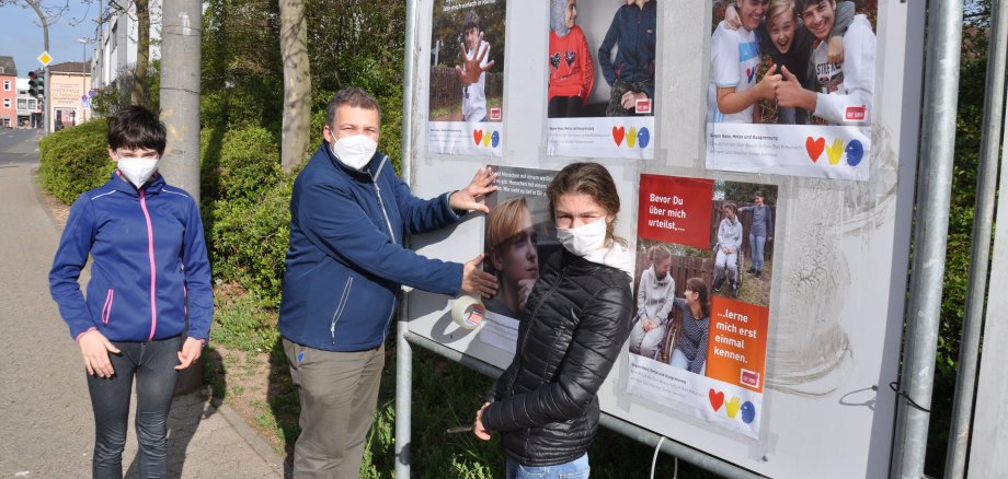 Die Don-Bosco-Schule war die erste, die das Angebot nutzte. Seit heute hängen fünf Plakate des Projektes „Gegen Hass, Hetze und Ausgrenzung“ an einer der Plakatstellwände in der Hochstraße vor dem Parkplatz an der Jahnhalle.