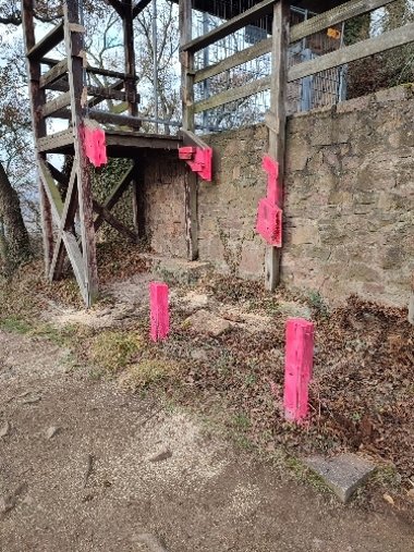 Der städtische Bauhof hat daher als Sofortmaßnahme die brüchigen Holzteile zurückgebaut, die Wege durch Bauzäune gesichert sowie Tore und Türen verschlossen. Die Arbeiten fanden unter erschwerten Bedingungen statt, da die Wege zur Burgruine für die Geräte und Maschinen nicht geeignet sind.