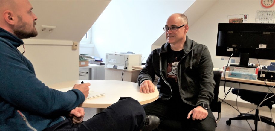 Foto: Jonathan Eberhart (links) im Gespräch mit Norbert Platz.