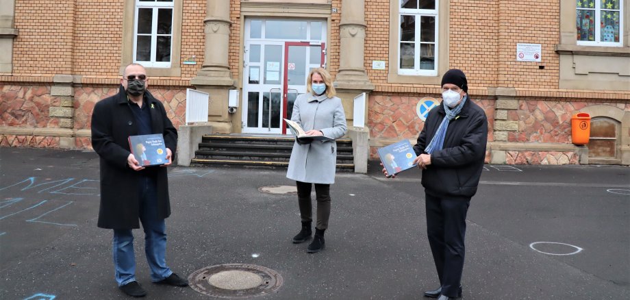 Foto: OB Dr. Heike Kaster-Meurer mit Manfred Schneider, Peerberater für seelische Gesundheit (links), und Dr. Richard Auernheimer, Geschäftsführer der Roswitha-Beck-Stiftung, vor der Grundschule Hofgartenstraße. Diese erhält wie alle Grundschulen in der Stadt sowie alle städtischen Kitas das Kinderbuch „Papas Seele hat Schnupfen“ zur Aufklärung über die Krankheit Depression in Familien. Die Grüne Schleife am Revers der Abgebildeten steht für mehr Akzeptanz von Menschen mit psychischen Erkrankungen.