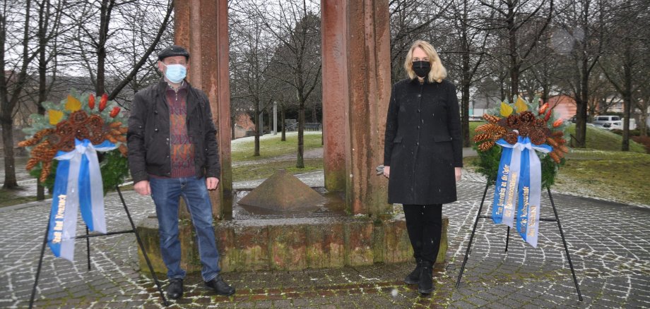 Großes Foto: OB Dr. Heike Kaster-Meurer und der Vorsitzende der jüdischen Gemeinde Bad Kreuznach/Birkenfeld, Valeryan Ryvlin, gedachten am Mahnmal in der Kirschsteinanlage der Opfer des Holocaust.
