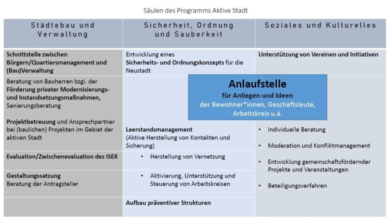 Die Quartiersarbeit im Fördergebiet „Lebendige Zentren - Aktive Stadt“ unterteilt sich fortan in drei Bereiche: Sicherheit, Ordnung und Sauberkeit (Oliver Kelm), Soziales und Kulturelles (Katharina Becker) sowie Städtebau und Verwaltung (Katharina Blagojevic). Zu den Aufgaben Oliver Kelms wird – in Zusammenarbeit mit dem Ordnungsamt – die Entwicklung eines Sicherheits- und Ordnungskonzepts für die Neustadt, das Leerstandmanagement mit der aktiven Vernetzung der Akteure und der Steuerung von Arbeitskreisen sowie der Aufbau präventiver Strukturen gehören.