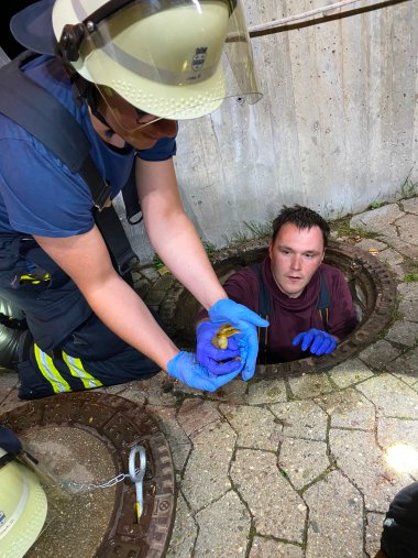 25 Tierrettungen wurden durchgeführt. Im Mai wurden einige Entenküken aus einem Kanaleinlauf in der Gensinger Straße (Foto) gerettet. Eine Katze wurde mit einem hydraulischen Spreizer hinter einem Pflanzkübel befreit. Im Juli steckte ein Igel in einem Zaun fest. Seine Stacheln wirkten wie Widerhaken. Mit einem Bolzenschneider wurde er aus seiner misslichen Lage befreit. Über die Drehleiter wurde eine Schwalbe am Dach eines Gebäudes in der Rheinstraße befreit, die sich in einer Schnur und Draht verfangen hatte.