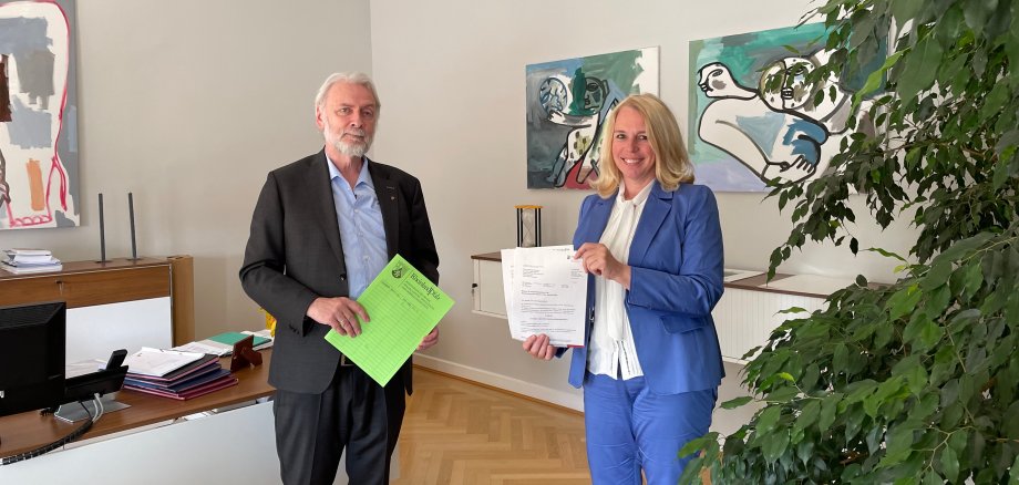 Foto: Kulturstaatssekretär Prof. Dr. Jürgen Hardeck übergibt OB Dr. Heike Kaster-Meurer den Förderbescheid.