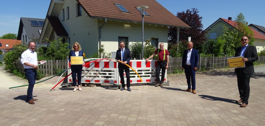 Foto, v.l.: Klaus-Dieter Dreesbach, stellvertretende Geschäftsführer Kreuznacher Stadtwerke, Oberbürgermeisterin Heike Dr. Heike Kaster-Meurer, Christoph Nath, Geschäftsführer Kreuznacher Stadtwerke, Dr. Volker Hertel, Ortsvorsteher Bosenheim, Albert Knodel, Ingenieurbüro Knodel, Roland Kieser, Ingenieurbüro Geodata