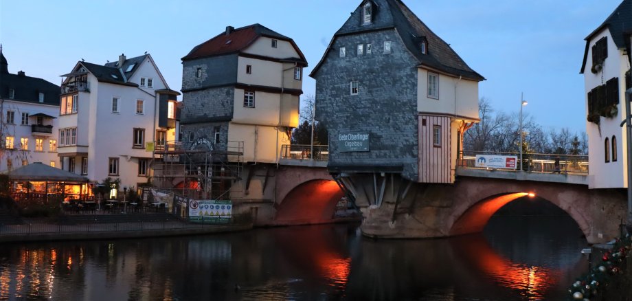 Foto: Sichtbares Zeichen gegen Gewalt an Frauen: Zu den „Orange Days“ leuchtet die Alte Nahebrücke ab Einbruch der Dunkelheit erstmals in Orange.