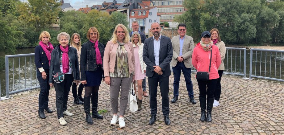 Großes Foto: OB Dr. Heike Kaster-Meurer mit Bürgermeister Jean-François Debat, der übrigen Delegation aus Bourg-en-Bresse und den Vertretern aus Bad Kreuznach an der Kirschsteinanlage.