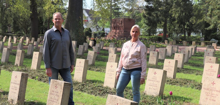 Foto ganz oben: Das erneuerte Ehrengrabfeld auf dem Hauptfriedhof präsentierten Friedhofverwalter Markus Foos und Stellvertreterin Christine Senft-Witt.
