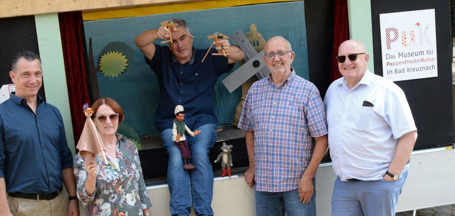 Großes Foto: Sie wünschen dem Puppenspieler Markus Dorner viel Erfolg: OB Emanuel Letz, Museumspädagogin Ursula Domidian, PuK-Fördervereins-Vorsitzender Arno Lergenmüller und Karl-Heinz Seeger, Geschäftsführer des PuK-Sponsors Gewobau.