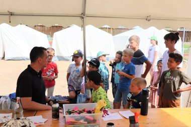 Letz schaute in den einzelnen Gruppenzelten vorbei, in denen Kinder mit ihren Betreuerinnen und Betreuern an Projekten arbeiteten – vom Puppentheater über Action Painting bis hin zum Malen mit Windows Colors. Die Gruppe der „Kido-Zeitung“ stellte zahlreiche interessierte Fragen zur Arbeit des Oberbürgermeisters und seiner Person, die Emanuel Letz den jungen Nachwuchsjournalistinnen und -journalisten gerne beantwortete.