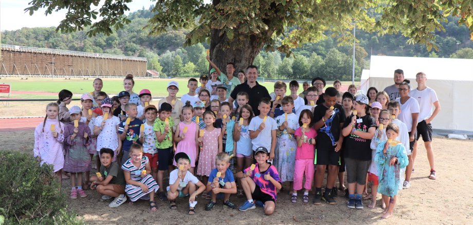 Großes Foto: Umringt von den Kindern des Feriendorfs: OB Emanuel Letz spendierte den Kindern ein Eis.
