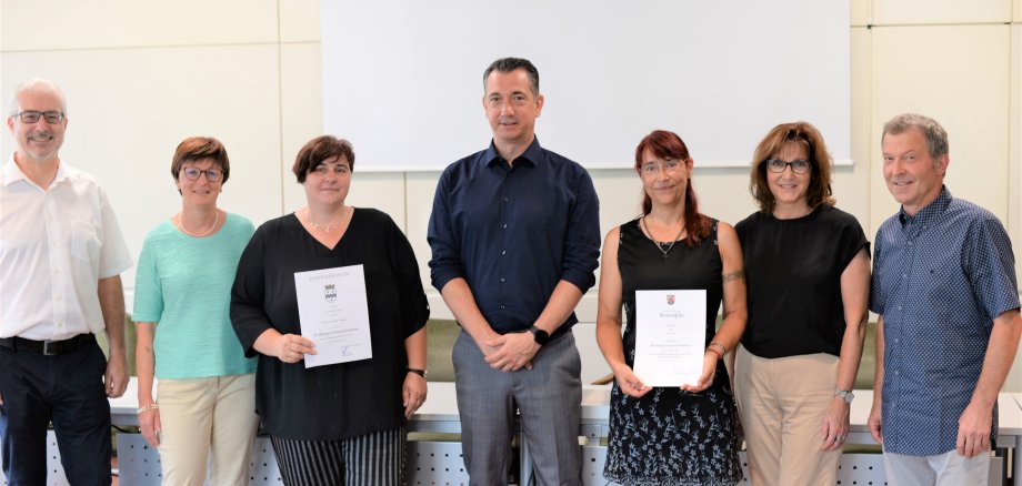 Foto, v.l.: Jens Heiko Renner, Alosia Hackenbruch, Carina Hagen, OB Emanuel Letz, Beate Roth, Elisabeth Horl und Ottmar Michel nach der Feierstunde.