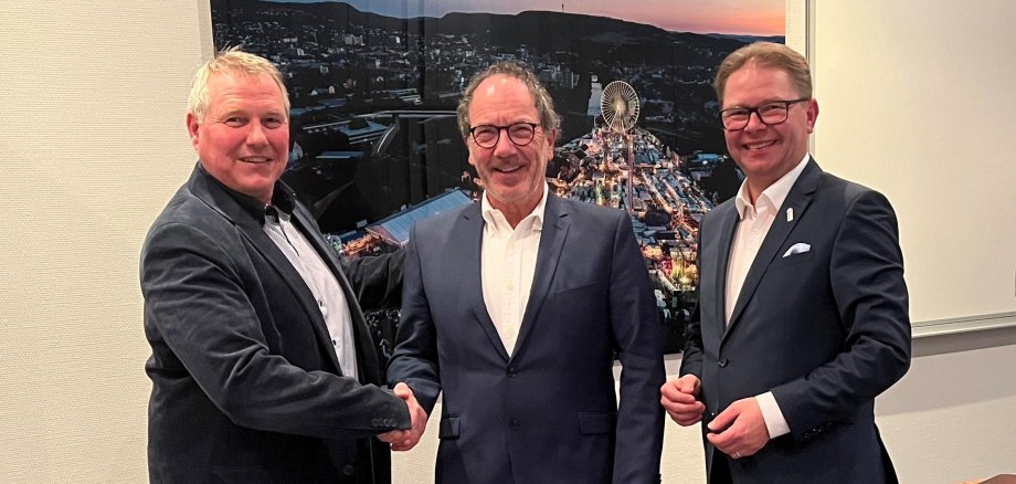 Foto: Es gratulieren Aufsichtsratsvorsitzender Bürgermeister Thomas Blechschmidt (links) und Christoph Nath, Geschäftsführer der Unternehmensgruppe Kreuznacher Stadtwerke, Klaus-Dieter Dreesbach (Mitte). Text und Foto: Kreuznacher Badgesellschaft