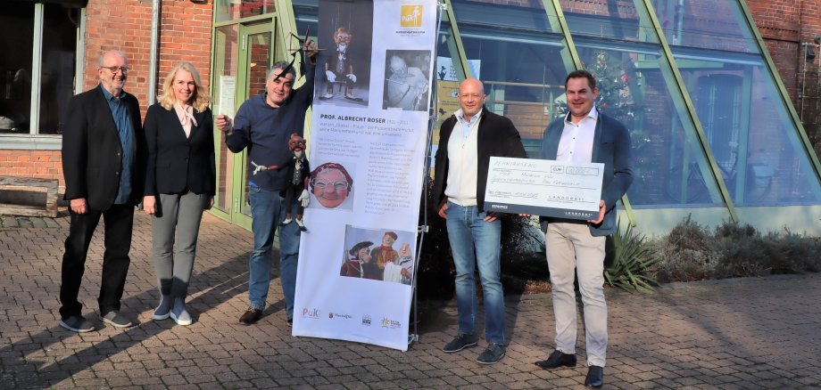 Foto: v.l.: Arno Lergenmüller (1. Vorsitzender Förderverein), OB Dr. Heike Kaster-Meurer und PuK-Museumleiter Markus Dorner (mit Clown Gustaf) nehmen die Spende in Höhe von 10.000 Euro von Unternehmer Klaus Landgraf und Thomas Herzmann (Management LANDGRAF® Group) entgegen.