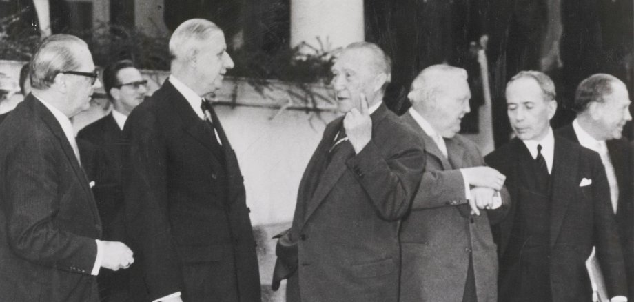Foto: Charles de Gaulle und Konrad Adenauer mit Delegationsmitgliedern auf der Kurhausterrasse beim Treffen am 26. November 1958. Foto: Stadtarchiv Bad Kreuznach/Hans Luhn