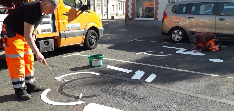 Großes Foto: Kurt-Reiner Thomas und Peter Borzutzky bringen die Markierungen auf den Behinderten-Parkplätzen in der Poststraße auf.