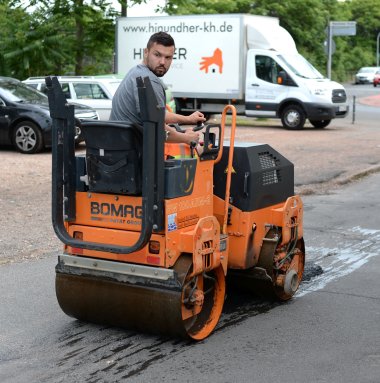 „Heiße Ware“ haben Alexander Kusmannn und Dennis Sünbül im Asphaltmischwerk Sprendlingen geholt. Die Thermokiste auf der Ladefläche ist gefüllt mit vier Tonnen Asphalt, die 180 Grad Temperatur wird in der Kiste gehalten, Damit füllen sich an diesem Tag die vielen Schlaglöcher im Kohleweg. Alexander Kusmann walzt die Masse, die der Kollege Dennis Sünbül in die Löcher geschippt hat, fest. Die Frühlingssonne meint es gut mit den Männern vom Bauhof. Im Sommer brennen zuweilen fast 40 Grad von oben und über 100 Grad dampfen von unten. Alexander Kusmann ist seit 2007 auf dem Bauhof und ging dort schon in die Lehre. Dennis Sünbül wechselte im Vorjah