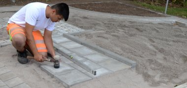 Harry Berends legt großen Wert auf die Ausbildung der Straßenbauer. Derzeit sind es zwei Azubis, künftig sollen es wieder sechs sein. Der „Sandkasten“ als Übungsstätte fürs Steine verlegen liegt an einem kleinen Teich, eine Oase auf dem Bauhofgelände.