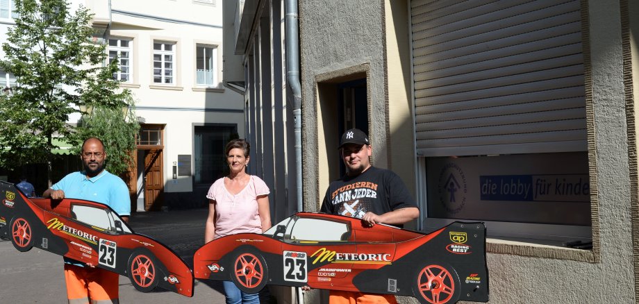 Foto: Michael Washington (links) und Christian Fetter überreichten Ines Stern die "roten Flitzer".